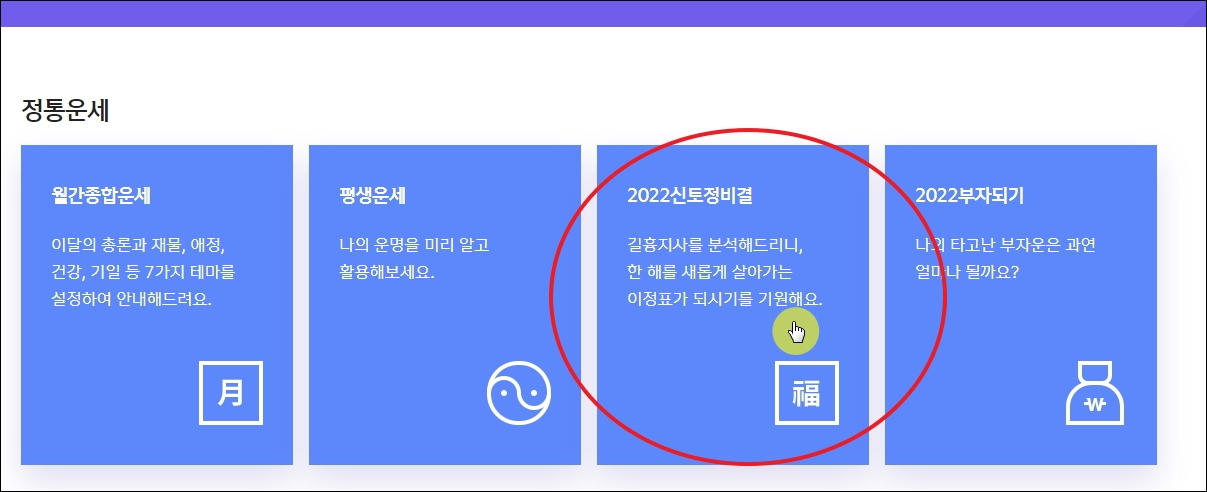 ▼이곳에서 제공하는 운세는 여러 종류가 있습니다. 그 중에서 정통운세의 경우 사주팔자를 보기에 적합한 종류로 되어 있습니다. 월간종합운세, 평생운세, 2022 신토정비결 등이 있죠.