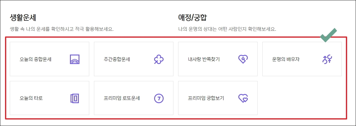 ▼생활운세와 애정 또는 궁합에 대한 것을 간단히 알아볼 수 있는 운세 서비스도 있습니다. 매일 나의 운세를 파악하고 싶거나 누군가 마음에 드는 상대방을 찾길 원할 때 사용하면 좋습니다.