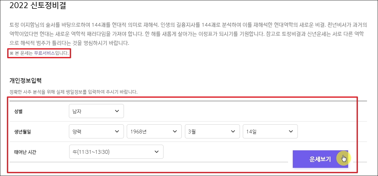▼이번 시간에는 해당 사이트에서 사주팔자 간단히 보는법을 알려드리겠습니다. 사주팔자의 경우 신토정비결 서비스를 이용하는 것이 좋습니다. 안내 문구에 명확하게 나와 있듯이 무료 서비스입니다. 간단히 개인정보를 입력하기만 하면 풀이 결과 확인이 가능합니다. 보는법을 따라해 보시죠. 성별, 생년월일, 태어난 시간을 정확하게 입력한 후 [운세보기] 버튼을 누릅니다.
