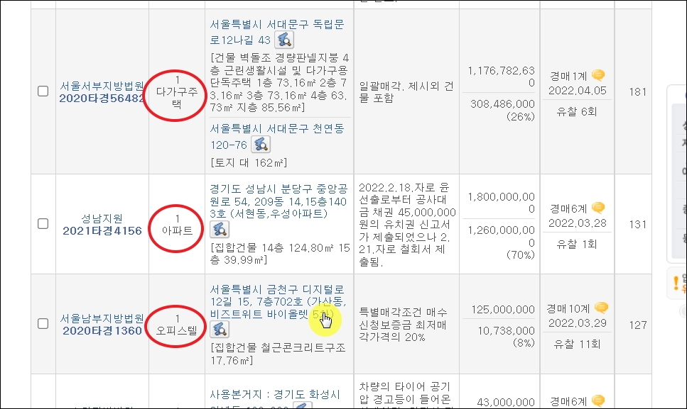 ▼자동차 외에도 다가구 주택, 아파트, 오피스텔과 같은 물건을 인터넷경매 사이트에서 만나볼 수 있습니다. 좀 더 자세하게 해당 물건에 대해 알아보고 싶다면 마우스로 클릭하면 됩니다.