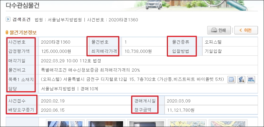 ▼사진 외에 설명의 경우에는 가장 먼저 물건 기본정보가 나옵니다. 대법원 경매에 참여할 때 필히 알고 있어야 하는 정보를 알려줍니다.