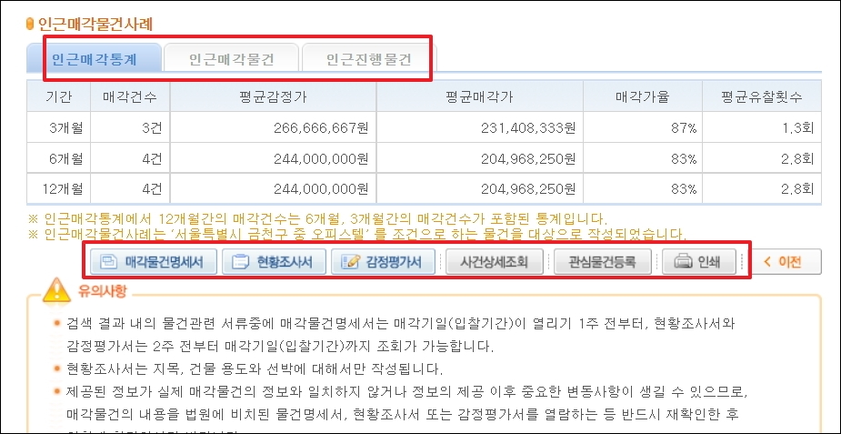 ▼해당 물건의 감정가 금액이 적정한지 궁금할 때에는 인근에 매각된 물건 사례를 살펴보면 됩니다. 인근 매각 통계표에 나와 있는 평균 감정가, 평균 매각가, 매각가율, 평균 유찰횟수를 참고할 수 있습니다. 이 밖에도 매각물건 명세서, 현황 조사서, 감정 평가서, 사건 상세 조회 등 추가 정보 확인이 가능합니다.