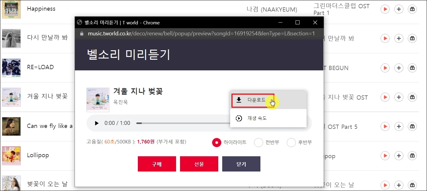 ▼오른쪽 끝 부분에 있는 버튼을 클릭하면 파일 다운로드와 재생 속도 변경을 할 수 있는 메뉴가 나타납니다. 여기에서 다운로드 버튼을 누르면 알송과 같은 음악 플레이어로 재생할 수 있는 파일을 컴퓨터에 저장할 수 있습니다. 무료로 다운로드 받는 것이기 때문에 음질이 나쁠 수 있는데, 직접 재생해보면 음질이 나쁘다는 느낌이 없습니다. 간편하게 본인 휴대폰에 해당 노래 음원을 벨소리 적용하고 싶다면 [구매] 버튼을 눌러 안내에 따라 진행하면 됩니다.