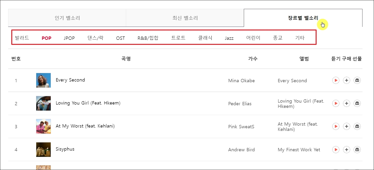 ▼사람마다 좋아하는 노래 장르가 다를 수 있습니다. [장르별 벨소리] 메뉴를 클릭을 해보면 발라드, 팝, JPOP, 댄스곡, OST, 락, 힙합 등 여러 장르를 선택할 수 있습니다. 장르별 추천 음원에 대한 순위를 확인할 수 있죠.