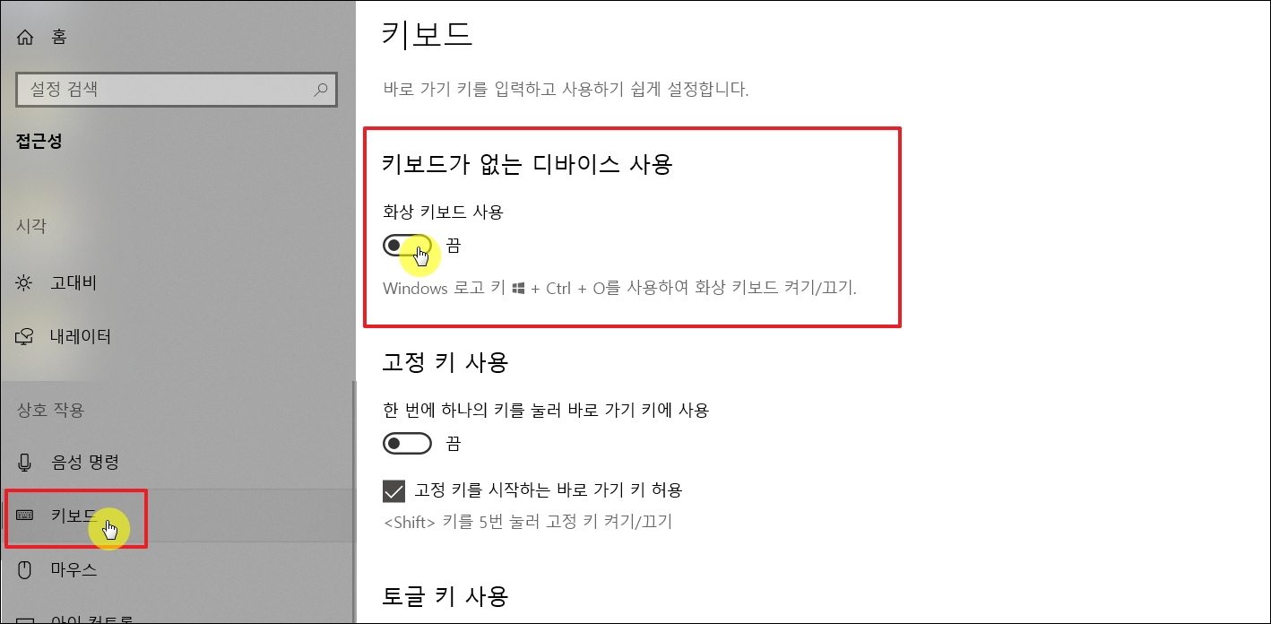 ▼[접근성] 페이지가 열리면 좌측에 여러 메뉴가 보일 겁니다. 고대비, 내레이터, 음성 명력, 키보드, 마우스 등이 있죠. 여기에서 엑셀 방향키 셀이동 문제 해결에 사용할 것은 [키보드] 메뉴입니다. 키보드 메뉴 선택 후 나타난 화면에서 가장 상단에 있는 [화상 키보드 사용]을 찾습니다. 키보드가 없는 디바이스를 사용하는 경우에 유용한 기능입니다. 기본적으로 [끔]으로 되어 있는데, 해당 영역을 클릭하면 [켬]으로 변경해 줍니다. 참고로 윈도우키 + Ctrl + O 이렇게 3가지 키를 누르면 화상 키보드를 켜거나 끄는 것도 가능합니다.
