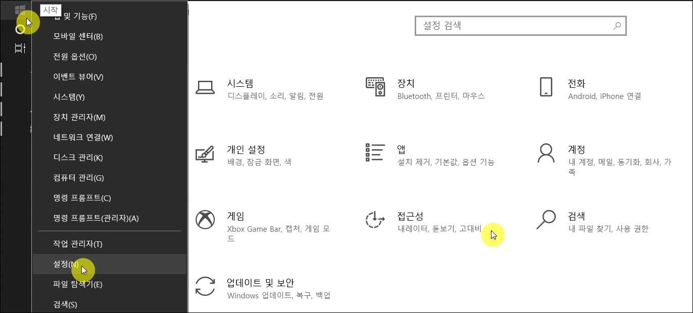 ▼윈도우10 기준으로 설명 드리겠습니다. 다른 버전의 윈도우 운영체제를 사용하는 경우에는 [제어판]을 실행하면 됩니다. 가장 먼저 [시작] 버튼에 마우스 우클릭을 해봅니다. 그럼 여러 가지 제어 메뉴가 나타납니다. 여기에서 [설정]으로 들어갑니다. 그럼 제어판 창이 열리는데, 여기에서 내레이터, 돋보기, 고대비 등을 대한 설정을 할 수 있는 [접근성] 메뉴를 선택합니다.