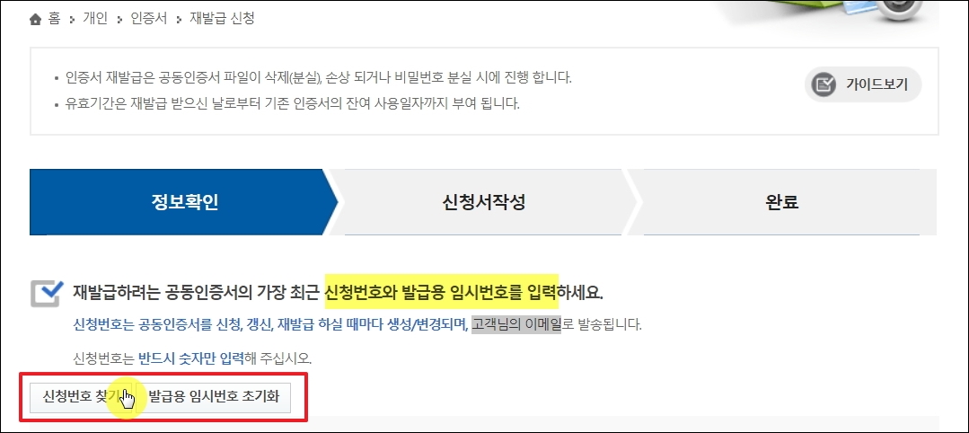 ▼재발급 신청 페이지가 열렸습니다. 여기에서 신청번호와 발급용 임시번호를 입력하면 재발급 진행을 할 수 있습니다. 해당 값은 [신청번호 찾기] 버튼과 [발급용 임시번호 초기화] 버튼을 통해 수월하게 알아낼 수 있습니다.