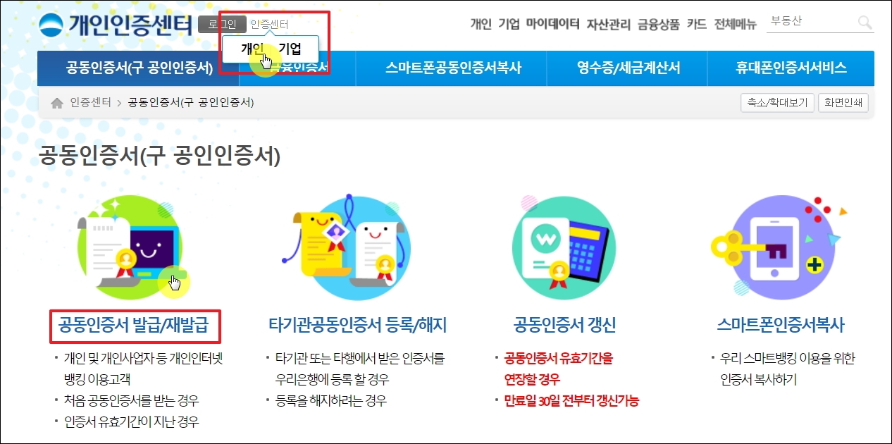 ▼두 번째 방법은 공인인증서 비밀번호가 전혀 기억이 나지 않을 때 사용할 수 있습니다. 바로 공인인증서 재발급을 신청하는 것입니다. 조금 번거롭긴 하지만, 암호 확인 서비스로 비밀번호를 찾지 못했을 때 사용하면 확실하게 해결이 가능합니다. 메뉴에서 사업자 또는 개인을 선택한 후 [인증서 재발급 신청] 버튼을 클릭하면 해당 페이지로 이동이 가능합니다.