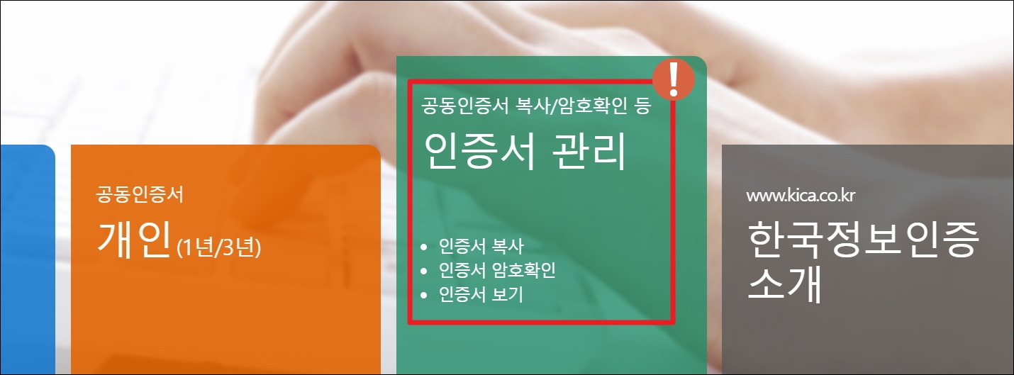 ▼한국정보인증 홈페이지에 접속했습니다. 메인화면을 보면 여러 개의 메뉴가 나타납니다. 여기에서 3번째에 있는 메뉴인 [인증서 관리]를 선택합니다.