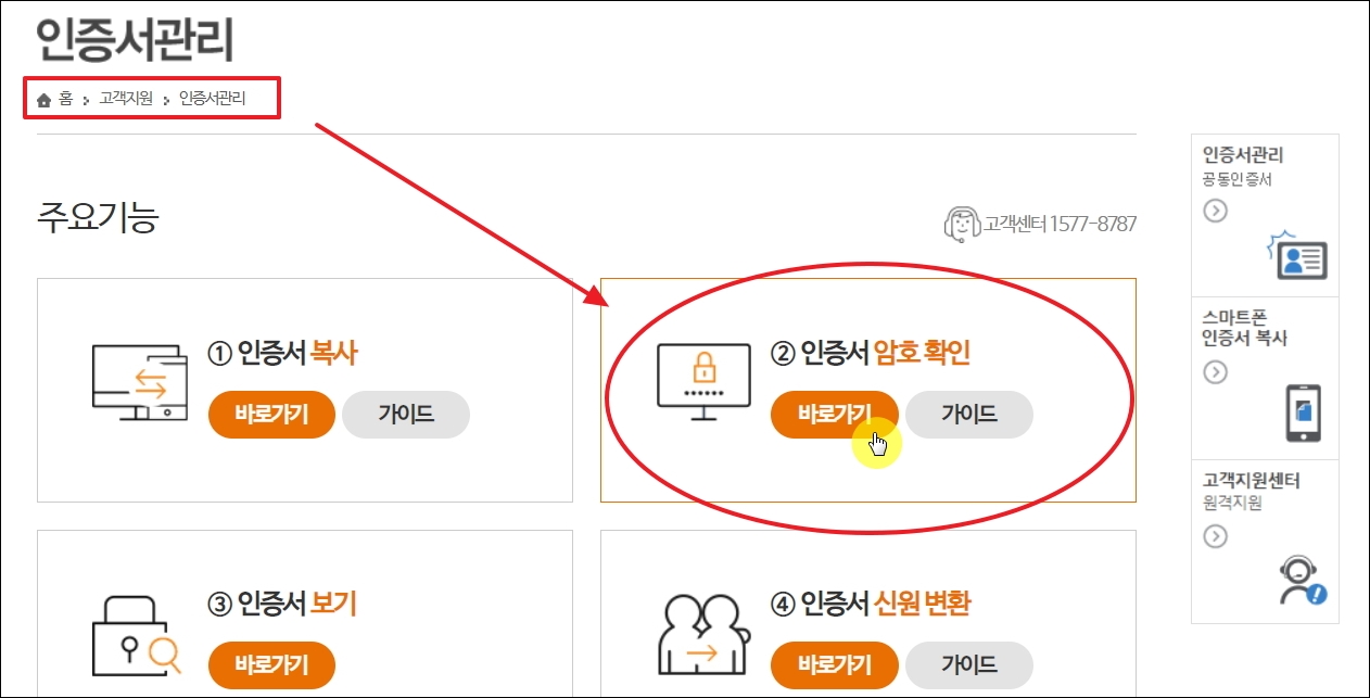 ▼한국정보인증 홈페이지에 접속했습니다. 메인화면을 보면 여러 개의 메뉴가 나타납니다. 여기에서 3번째에 있는 메뉴인 [인증서 관리]를 선택합니다.