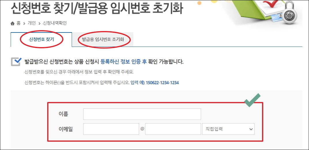 ▼공인인증서의 주인이 본인인 경우 인증서 발급 신청 시 사용한 이름과 이메일 주소를 사용하여 신청번호와 발급용 임시번호를 얻을 수 있습니다.