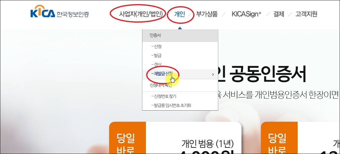 ▼두 번째 방법은 공인인증서 비밀번호가 전혀 기억이 나지 않을 때 사용할 수 있습니다. 바로 공인인증서 재발급을 신청하는 것입니다. 조금 번거롭긴 하지만, 암호 확인 서비스로 비밀번호를 찾지 못했을 때 사용하면 확실하게 해결이 가능합니다. 메뉴에서 사업자 또는 개인을 선택한 후 [인증서 재발급 신청] 버튼을 클릭하면 해당 페이지로 이동이 가능합니다.