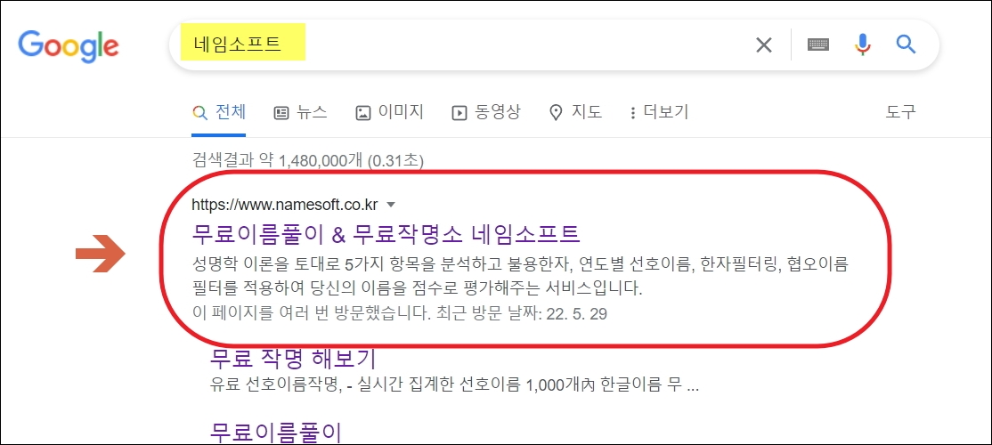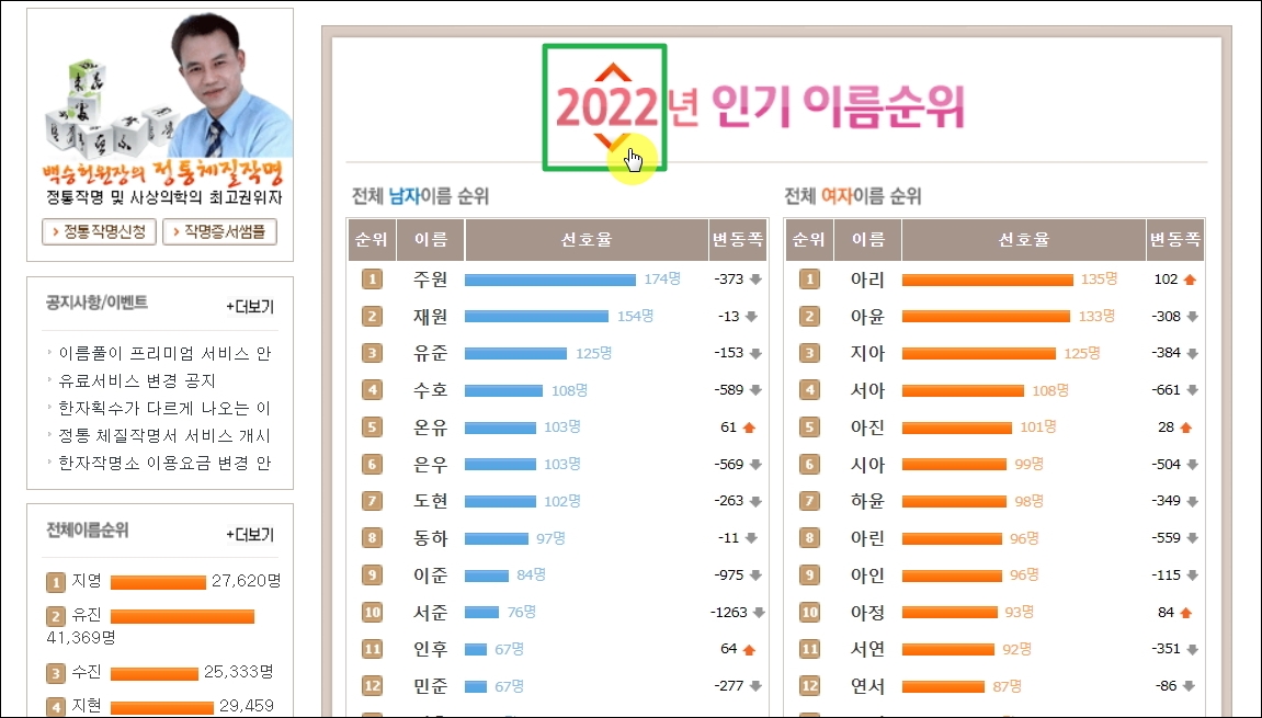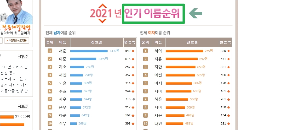 ▼올해 남자 이름 랭킹을 살펴보고, 무료로 작명까지 하는 방법을 알려드리겠습니다. 온라인 상에서 작명 서비스를 제공하는 네임소프트 사이트를 이용하면 됩니다. 유료로 있지만, 무료 서비스를 통해 우리가 원하는 것을 얻을 수 있습니다.