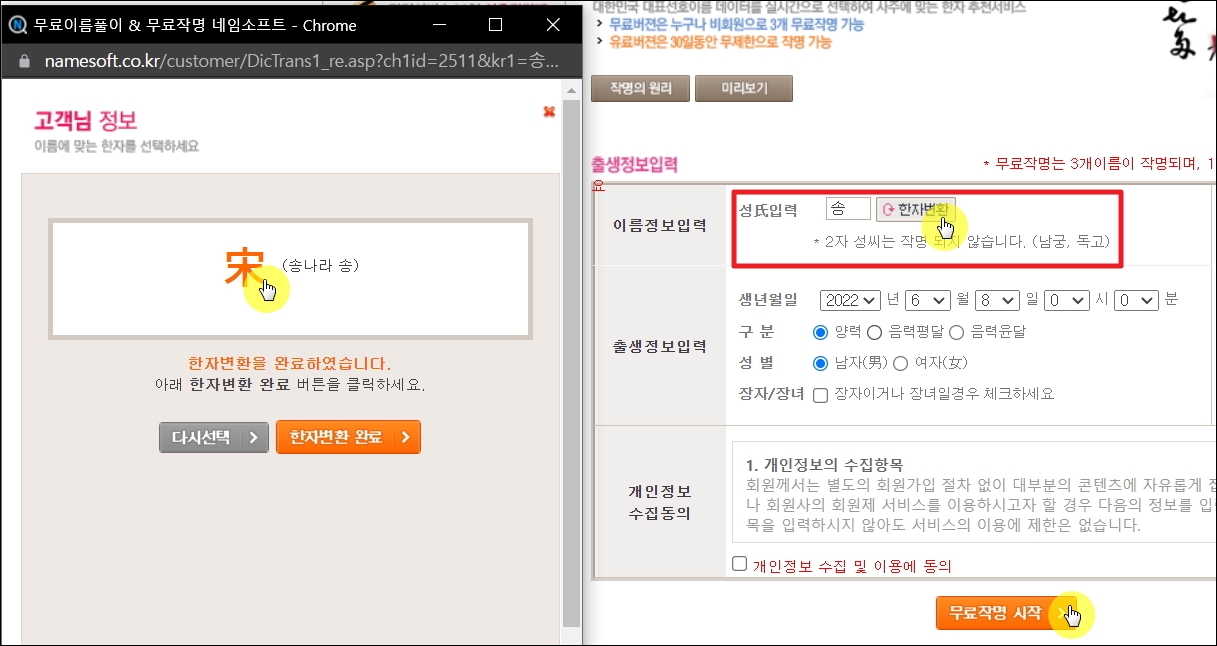 ▼작명이나 개명을 위한 이름 추천을 받기 위해서는 몇 가지 정보를 입력해야 합니다. 성씨, 생년월일, 성별, 장자 또는 장녀 여부를 입력하면 됩니다. 모든 항목을 입력했으면 [무료작명 시작] 버튼을 클릭합니다.