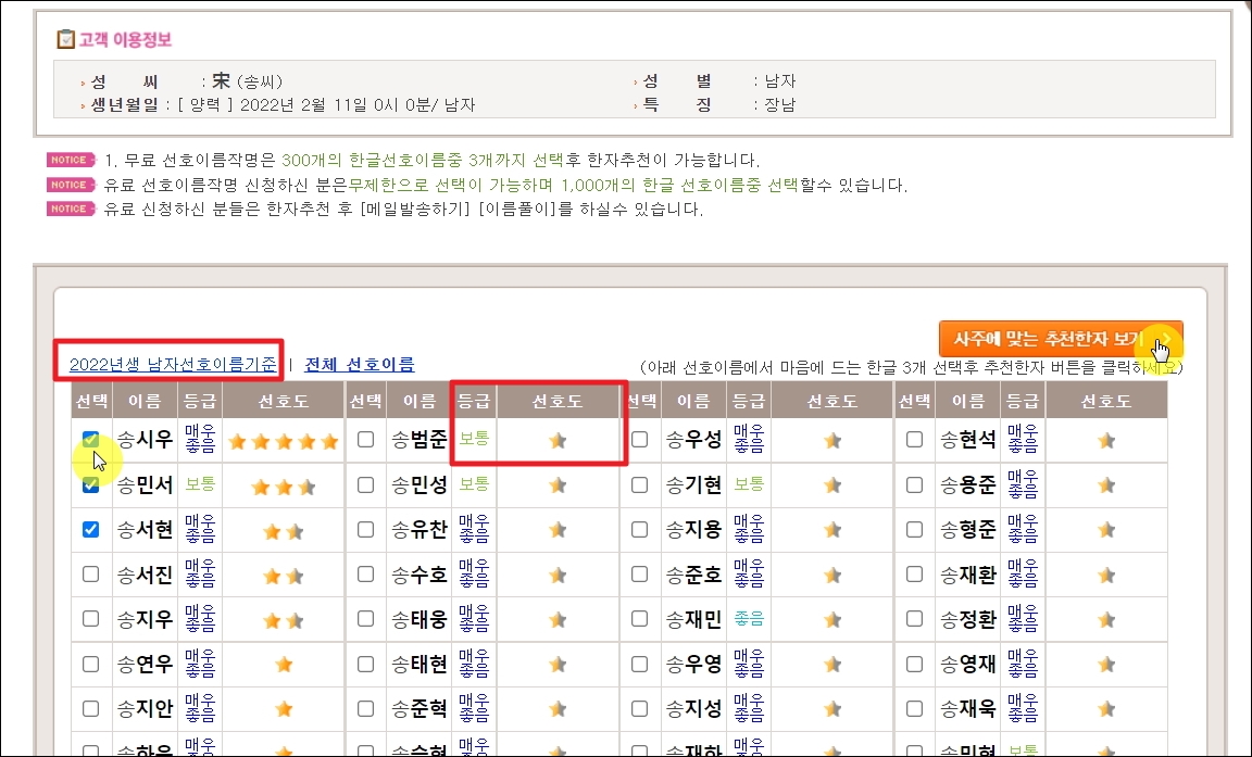 ▼작명 결과가 나왔습니다. 남자 이름 모음 300개로 되어 있는 표로 확인이 가능한데요. 등급과 선호도를 기준으로 순위가 매겨져 있습니다. 선호도는 인기를 나타내고, 등급은 성명학을 바탕으로 평가했을 때 얼마나 좋은지를 나타냅니다. 마음에 드는 성명을 3가지 선택한 후 [사주에 맞는 추천한자 보기] 버튼을 클릭해 보세요. 그럼 성명학 분석을 통해 사용하기 좋은 한자를 추천 받을 수 있습니다.