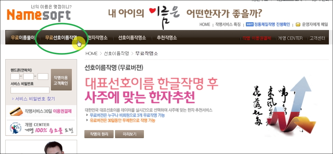 ▼네임소프트 사이트를 이용하여 남자 이름 추천을 받아보도록 하겠습니다. 메뉴에 있는 [무료 선호 이름 작명] 버튼을 클릭해 보세요.