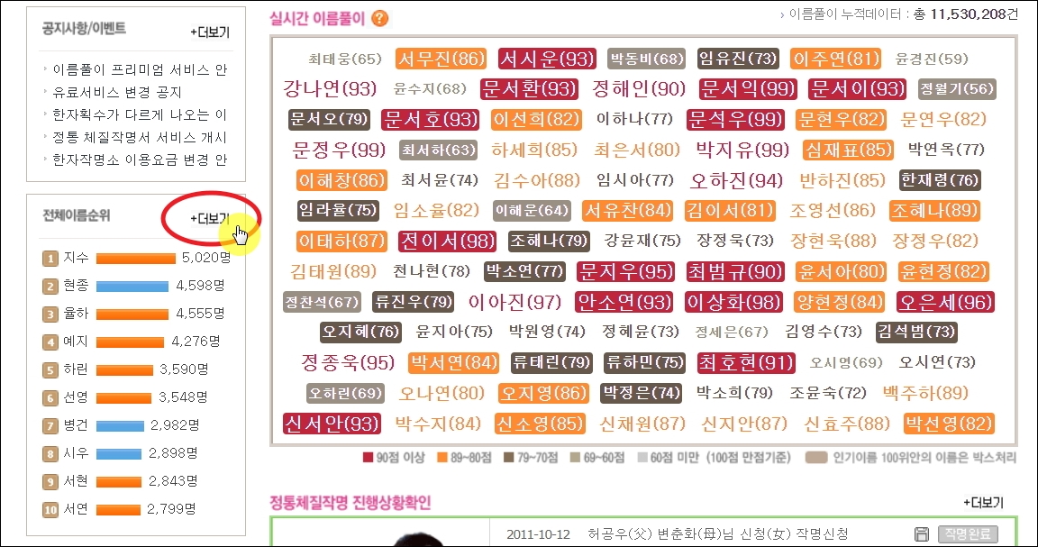 ▼네임소프트 사이트에 접속했습니다. 메인화면을 보면 사이트 이용자들이 이용한 이름풀이 이력을 확인할 수 있습니다. 사이트 좌측에 보면 전체 이름 순위 목록이 있는데, 남자와 여자를 따로 보려면 [더보기] 버튼을 누르면 됩니다.