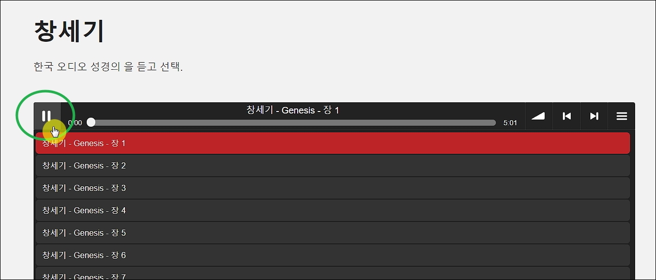 ▼저는 창세기를 선택했습니다. 성경듣기 하는 방법은 간단합니다. 플레이어에서 장을 선택한 후, 플레이어 좌측 상단에 있는 재생 버튼을 클릭하기만 하면 됩니다.