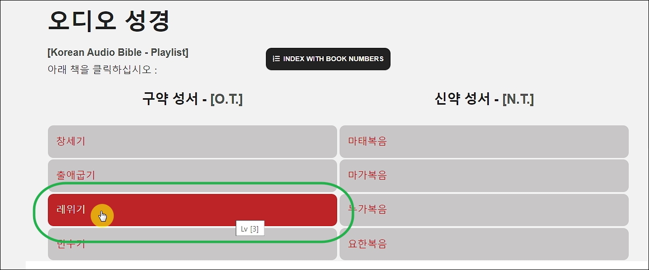 ▼한국어 버전으로 된 오디오 페이지가 열렸습니다. 구약성서와 신약성서에 속한 챕터를 선택해 주세요. 창세기, 출애굽기, 인수기, 마태복음, 마가복음, 누가복음, 요한복음 등을 포함해서 처음부터 끝까지 모두 성경듣기 가능합니다.