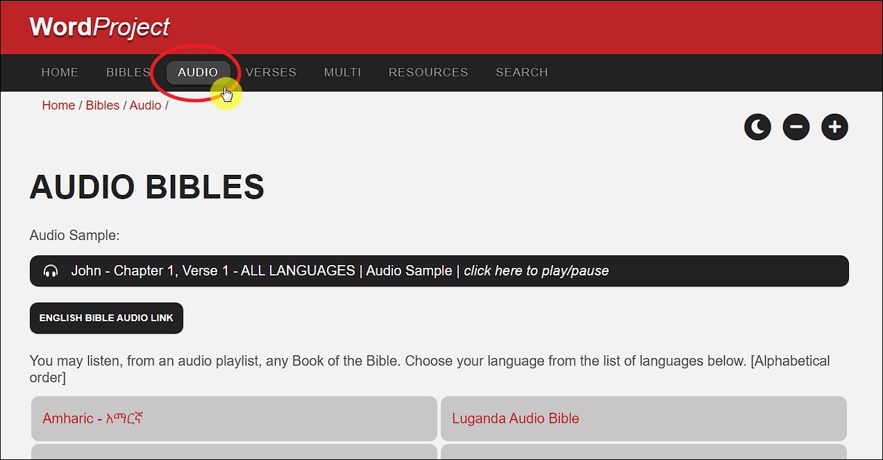 ▼wordproject 사이트에 접속했습니다. 메뉴에서 [AUDIO]를 클릭해 주세요.