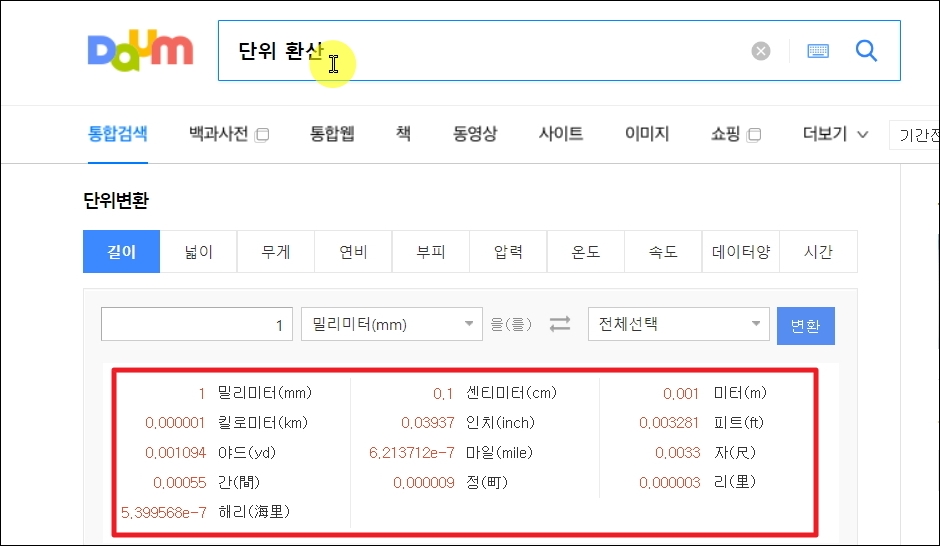 ▼이번에는 온라인 서비스로 간단하게 계산이 가능한 거리 단위 환산 프로그램을 사용해 보겠습니다. 다음 사이트에서 "단위 변환"이라고 검색을 하면 해당 프로그램이 바로 나타납니다.