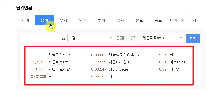▼거리와 함께 넓이 단위에 대한 환산도 진행이 가능합니다. 넓이에서는 제곱미터, 제곱피트, 헥타르, 단보, 제곱킬로미터, 제곱야드, 에이커, 정보, 평, 야르, 평방자를 사용합니다.