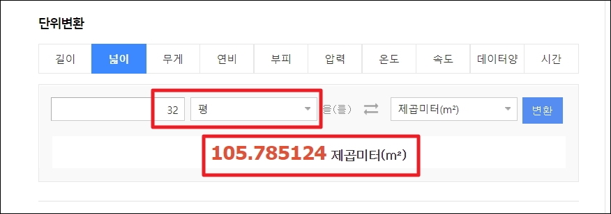 ▼아파트 넓이를 계산할 때 헷갈리는 예시를 하나 가져와 보았습니다. 32평의 경우에는 제곱미터로 변환한 결과 105.78124 제곱미터 였습니다. 간단하게 내용을 입력한 후, 변한 버튼을 누르면 이런 결과를 얻을 수 있습니다.